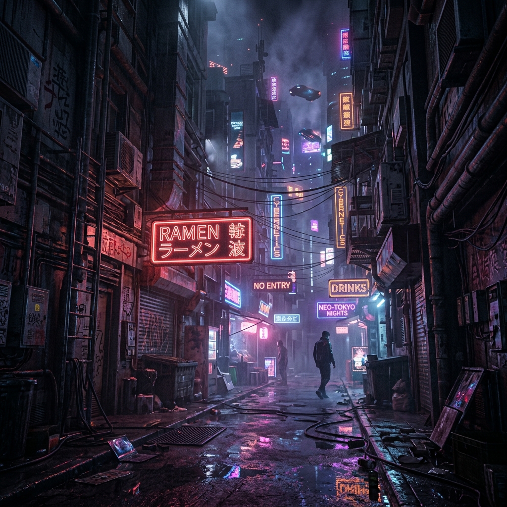 Night-time cyberpunk alleyway. Full environment build with volumetric lighting and atmospheric fog passes.